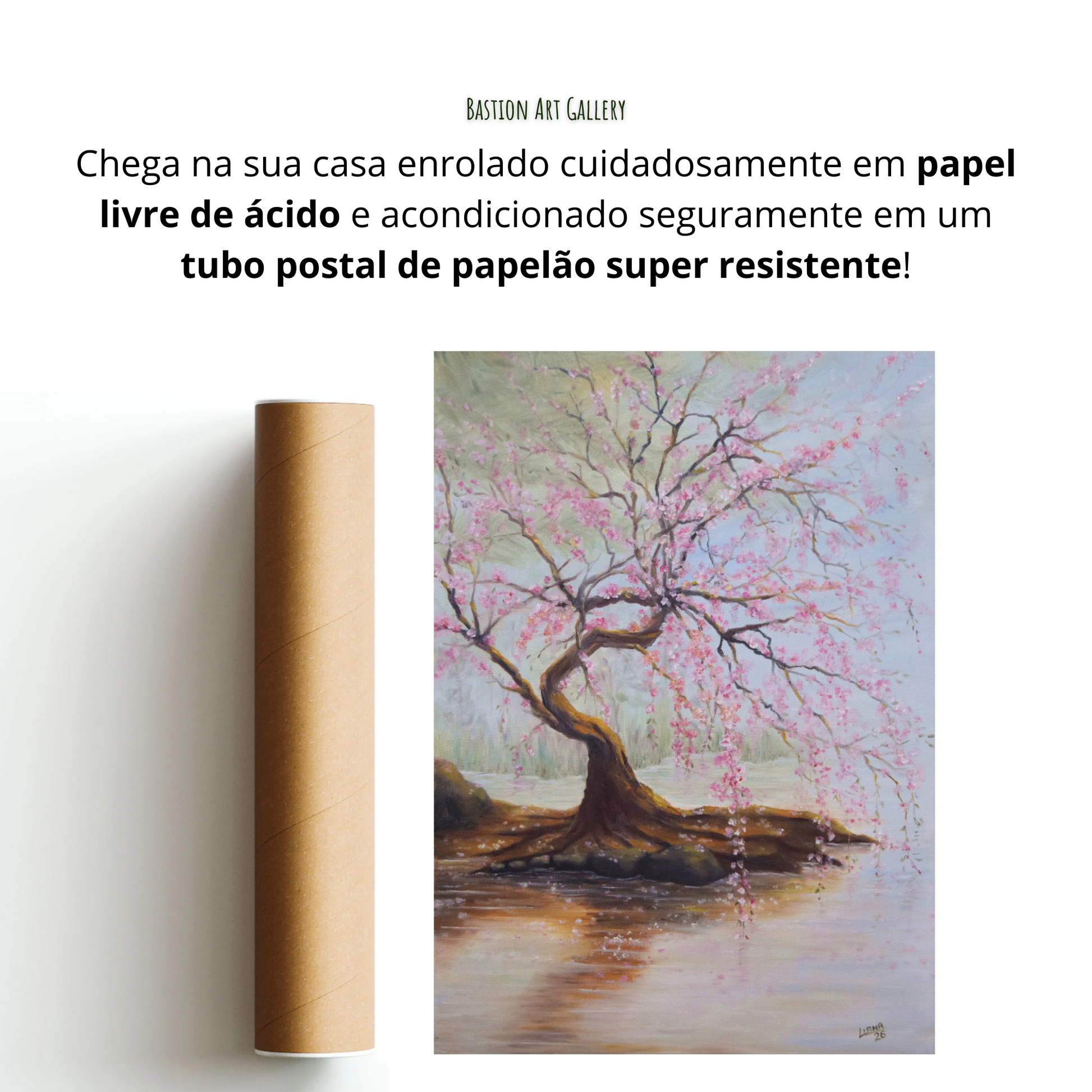 - A obra vai embalada de forma segura, protegida por papel livre de ácido e acondicionada em tubo postal resistente