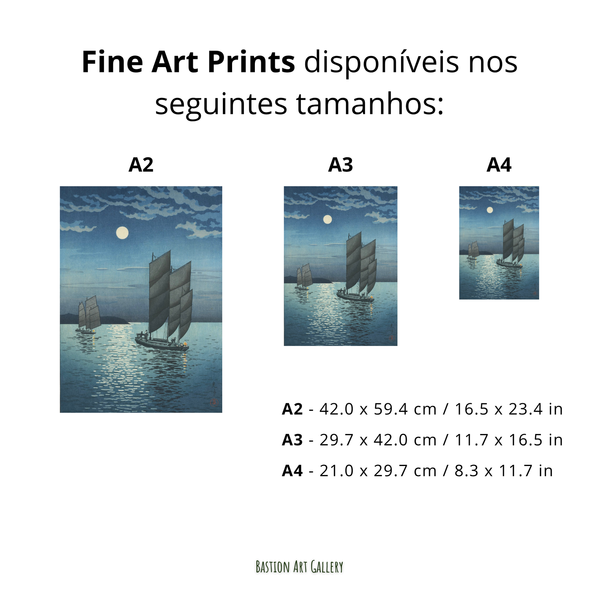 Koitsu explora habilmente os reflexos da lua na água, com leves ondulações que capturam a luz prateada, enquanto as velas dos barcos sugerem movimento lento e silencioso. As figuras a bordo são discretas — quase silhuetas — o que reforça o sentimento de paz e isolamento no cenário noturno.