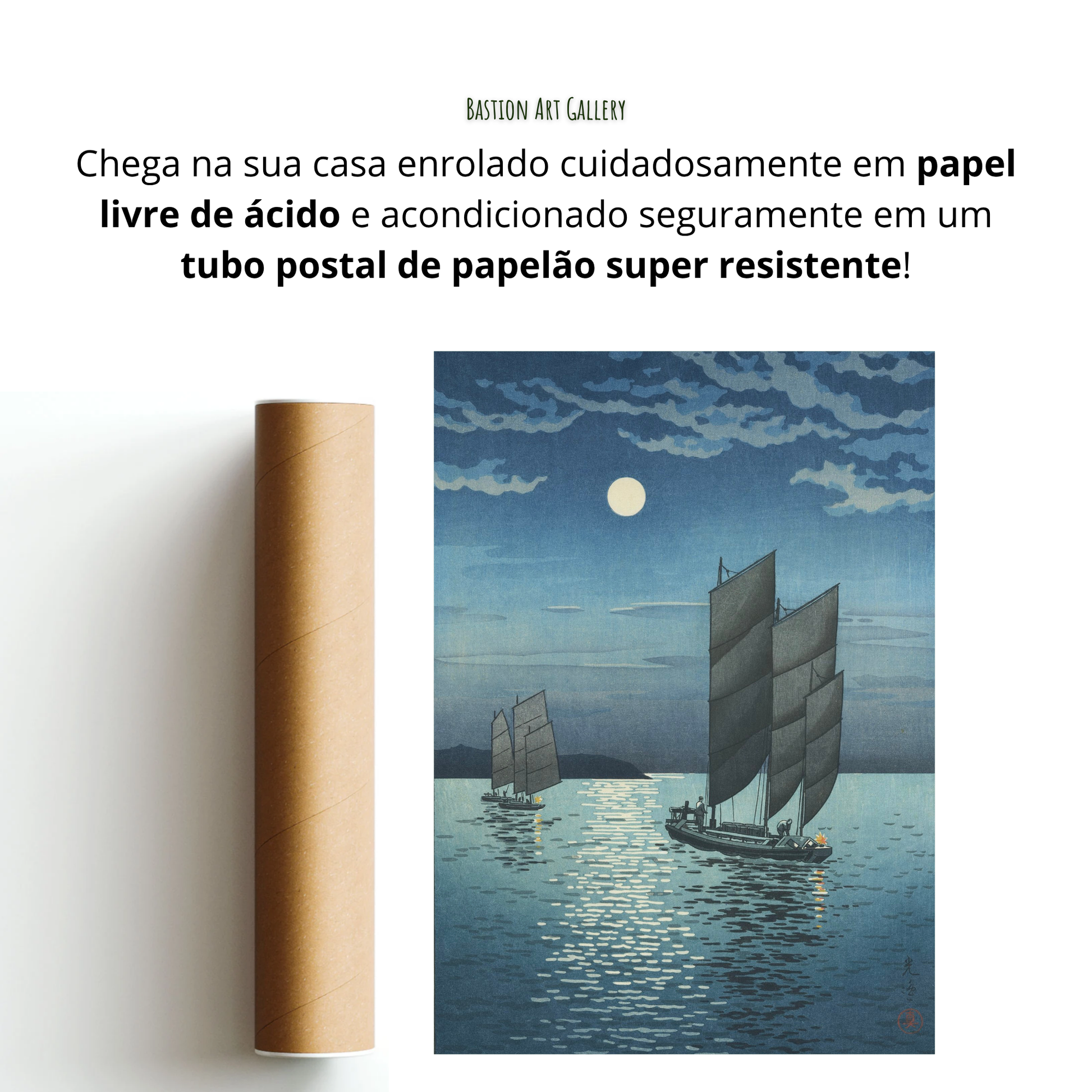 - A obra vai embalada de forma segura, protegida por papel livre de ácido e acondicionada em tubo postal resistente