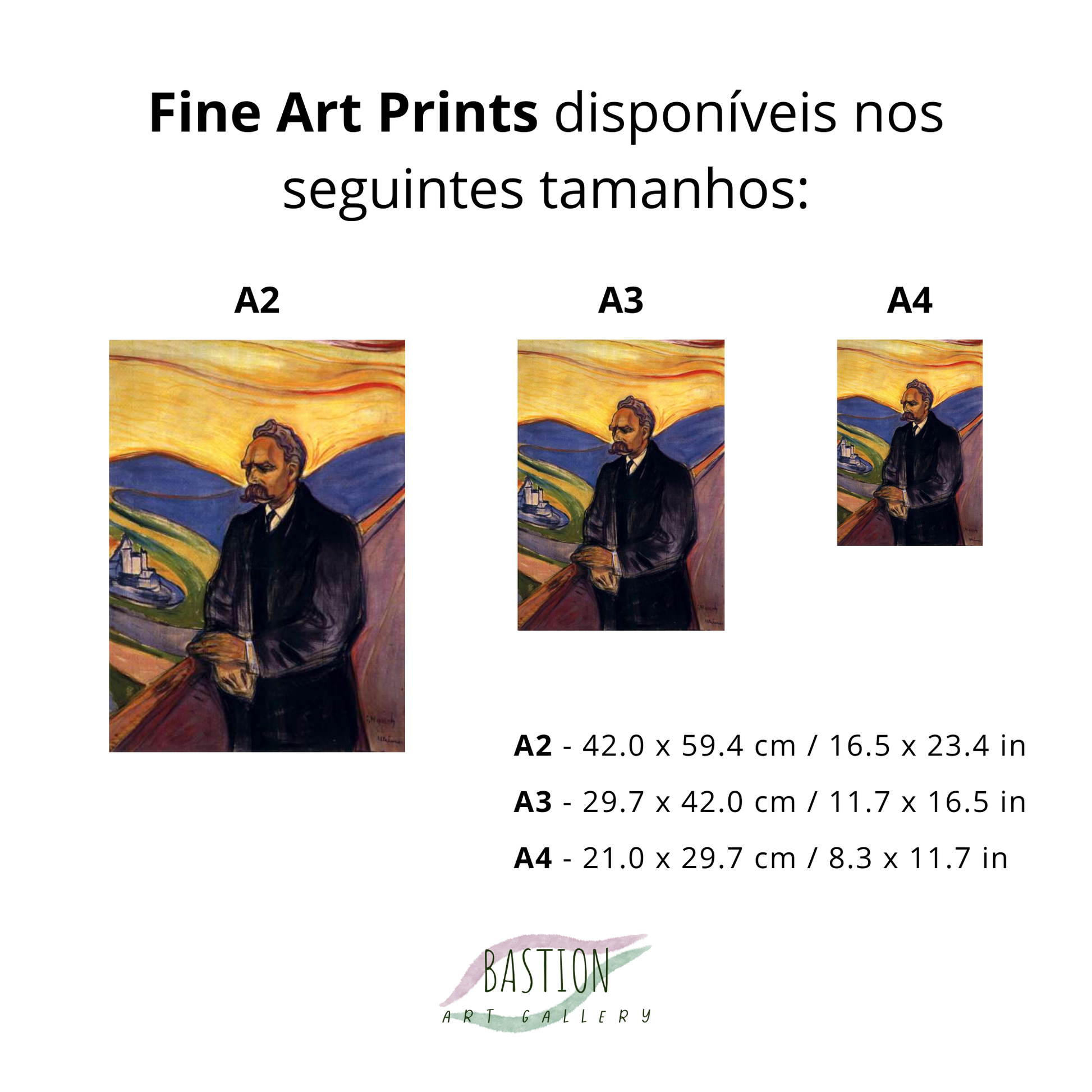 Executada em óleo sobre tela, a obra mede 201 x 160 cm (aproximadamente 79 x 62 polegadas) e apresenta Nietzsche com uma expressão contemplativa, de olhar baixo, em pé sobre uma ponte com um fundo de paisagem estilizada, onde cores vibrantes como amarelos, laranjas e azuis criam um céu dramático, refletindo a intensidade de suas ideias filosóficas.