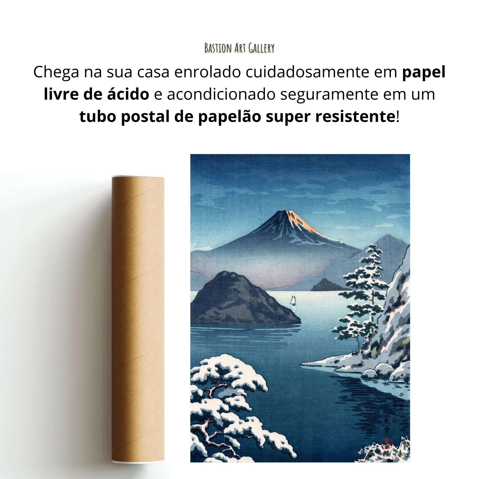 - A obra vai embalada de forma segura, protegida por papel livre de ácido e acondicionada em tubo postal resistente