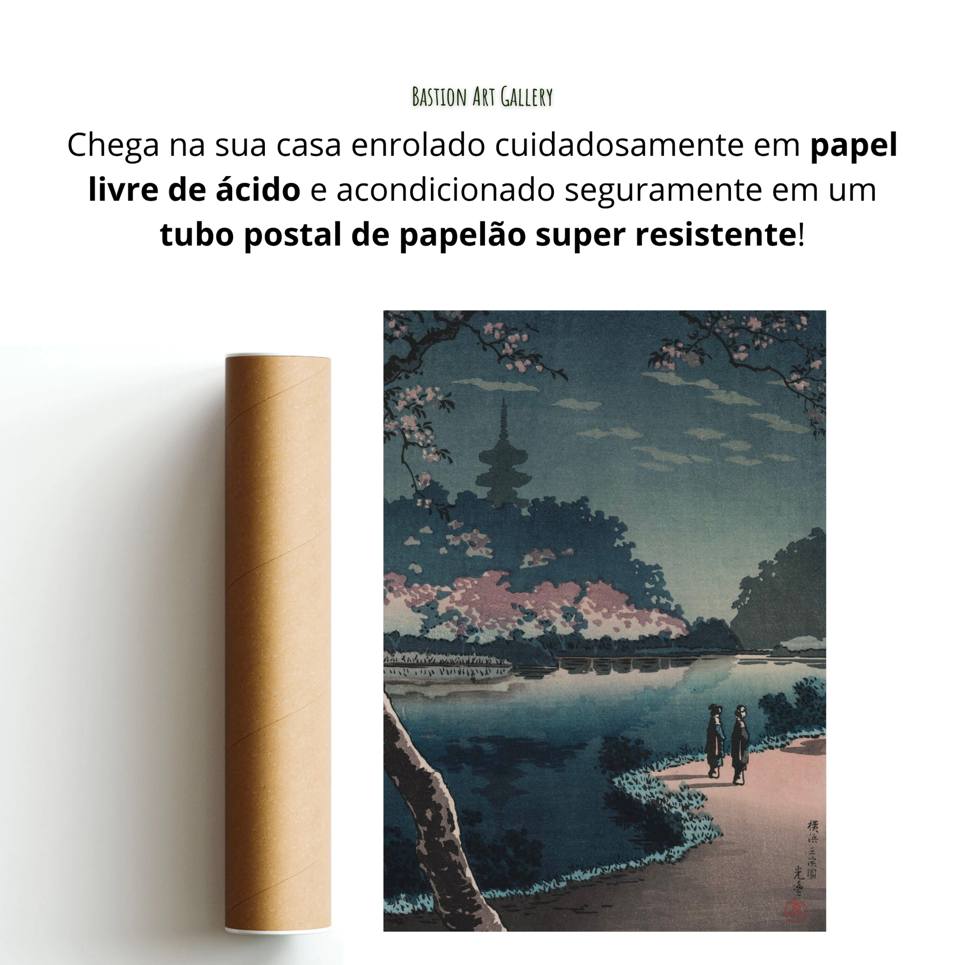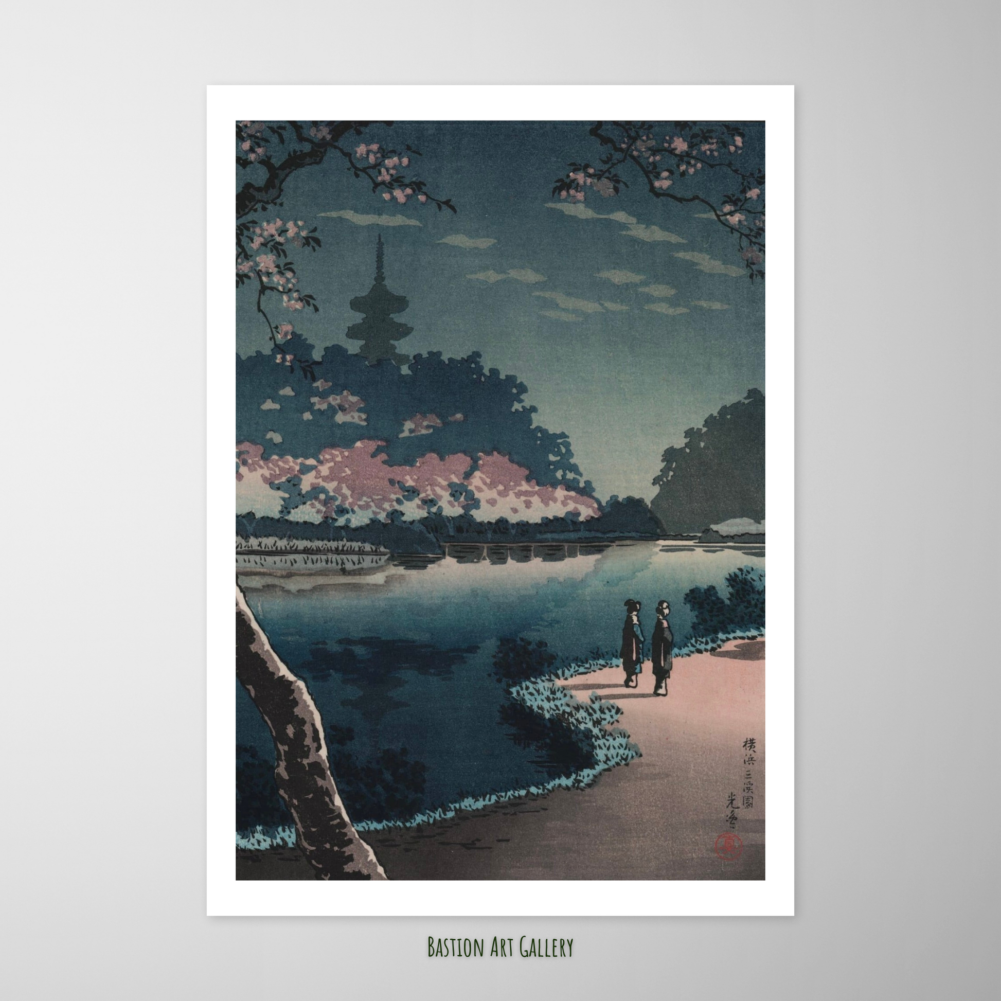 Nesta gravura shin-hanga, Koitsu retrata um momento sereno no tradicional Jardim Sankei (Sankei-en), em Yokohama, focando no lago Shinobazu. Apesar do nome “Shinobazu Pond”, a cena não se refere ao famoso lago de Ueno, mas sim a uma parte ornamental do jardim histórico projetado por Sankei Hara.