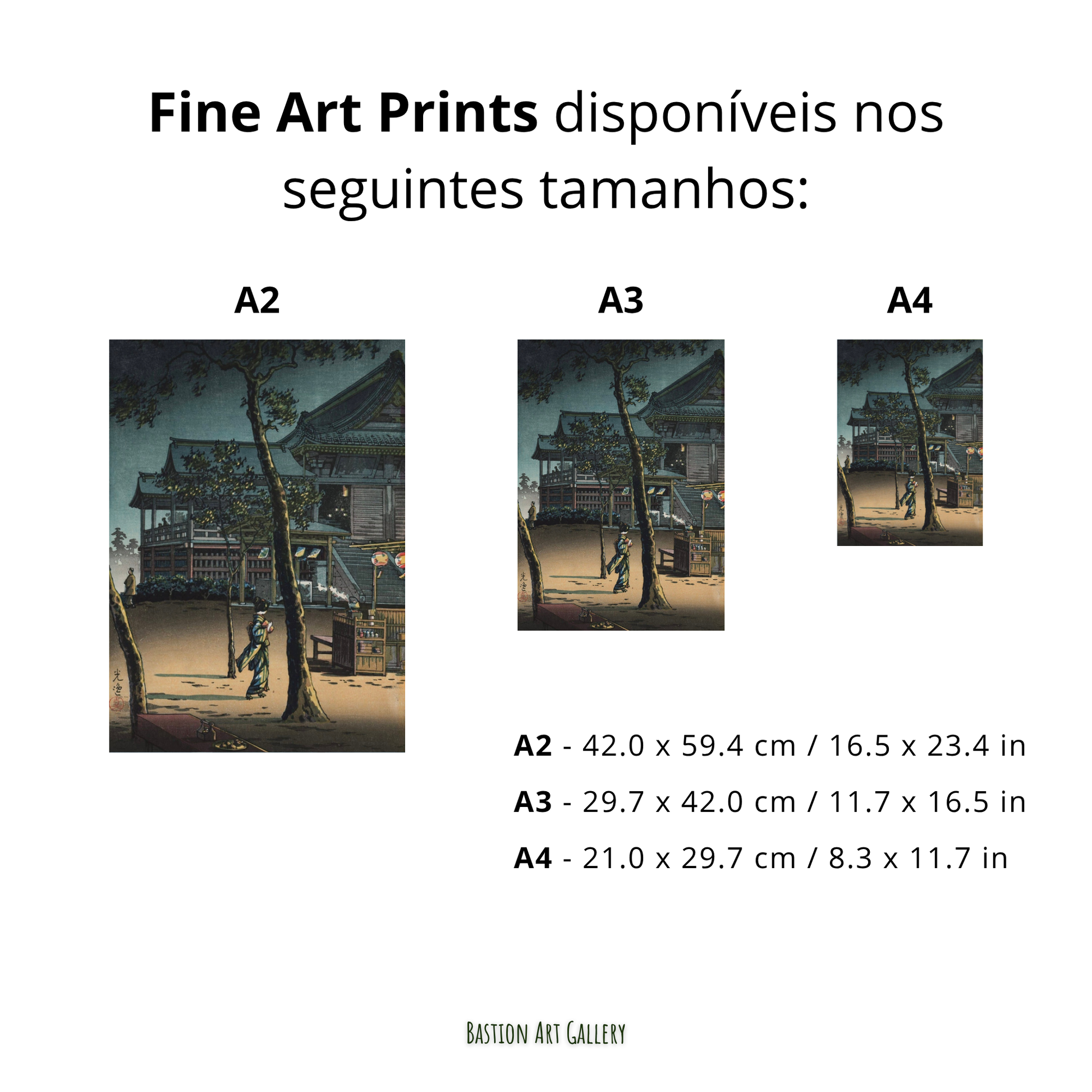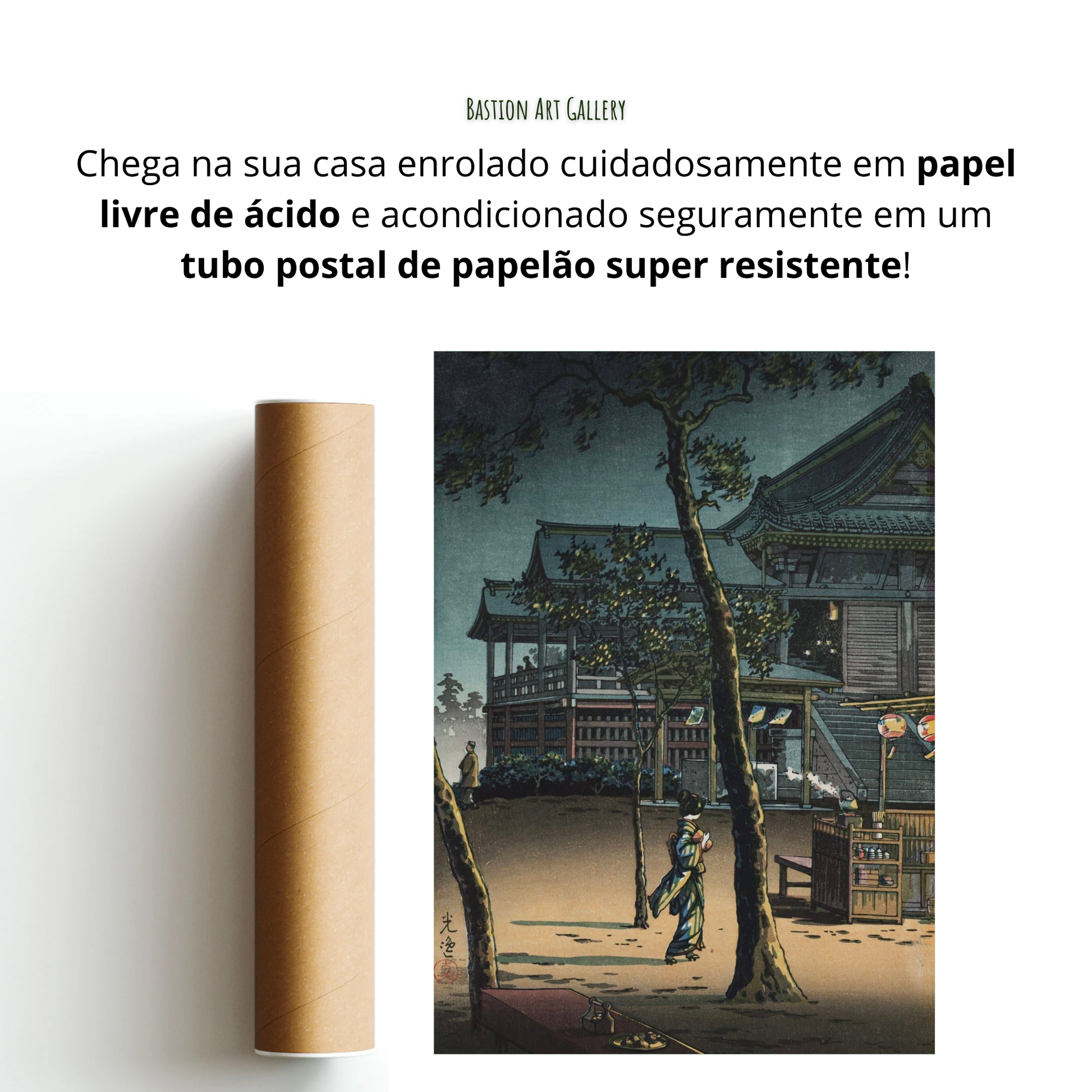 Nesta gravura, Tsuchiya Koitsu retrata uma cena noturna e íntima na área de Ueno, em Tóquio, especificamente no caminho ou pátio do Kiyomizudō (um templo ou casa de chá). Uma figura feminina caminha em direção a uma casa de chá iluminada por lanternas penduradas, enquanto uma chaleira sobre um brasero libera vapor, sugerindo calor e acolhimento humano.