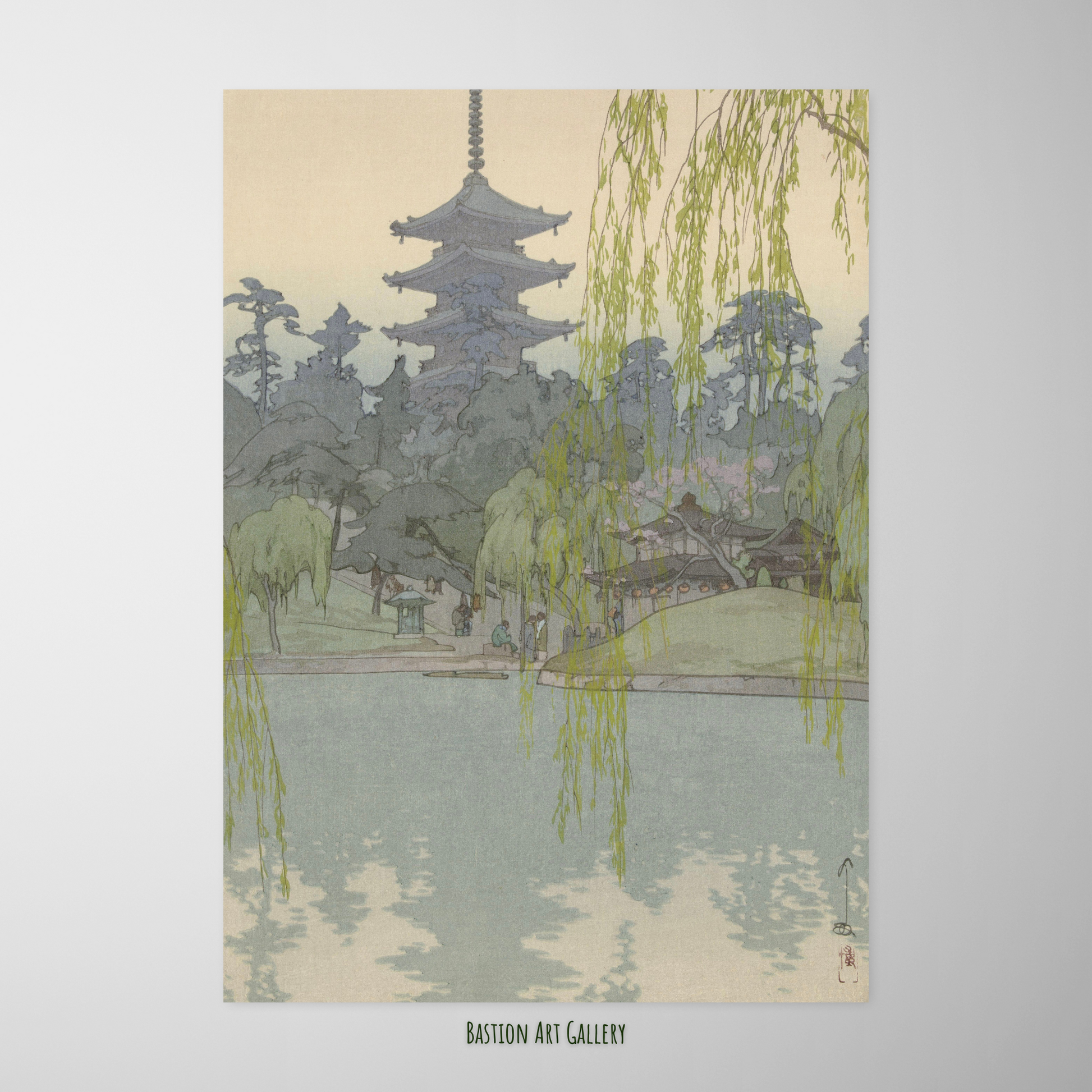 Os ramos pendentes de salgueiro atravessam o campo pictórico como um véu translúcido, introduzindo ritmo e profundidade ao espaço enquanto filtram o olhar do observador em direção à paisagem distante. A silhueta da pagoda emerge entre as camadas de vegetação, suavizada por uma atmosfera luminosa que sugere as primeiras horas do dia ou o entardecer.