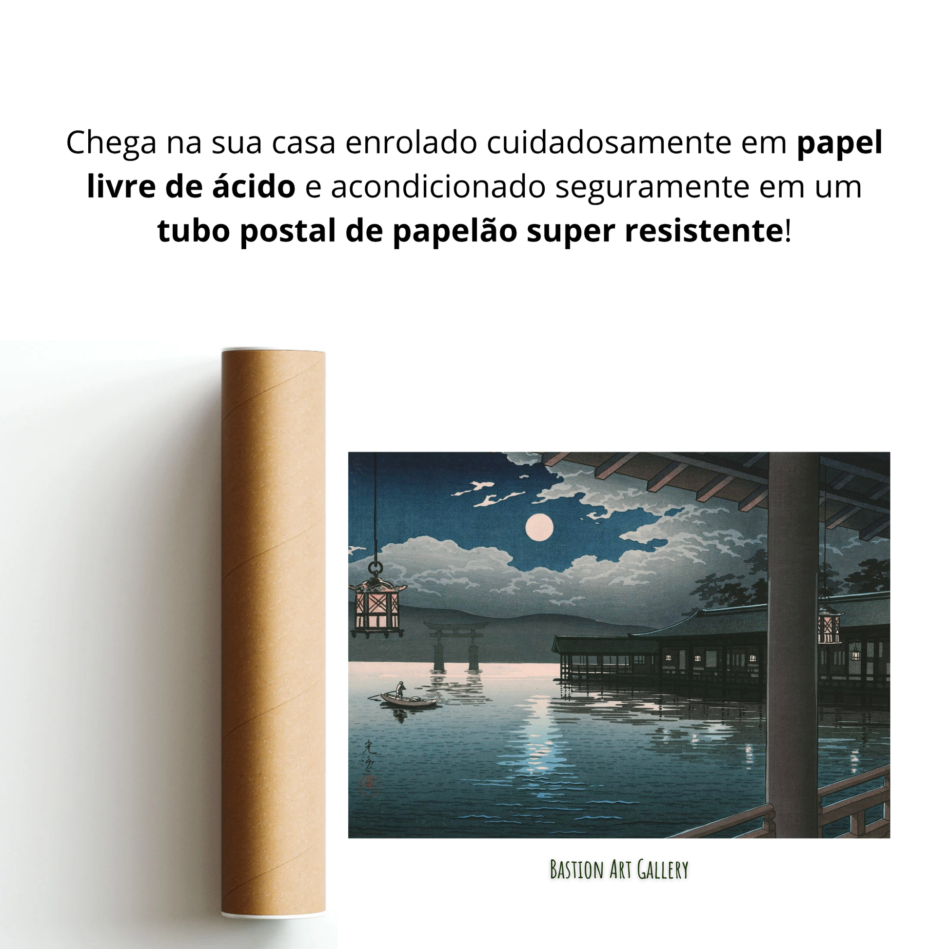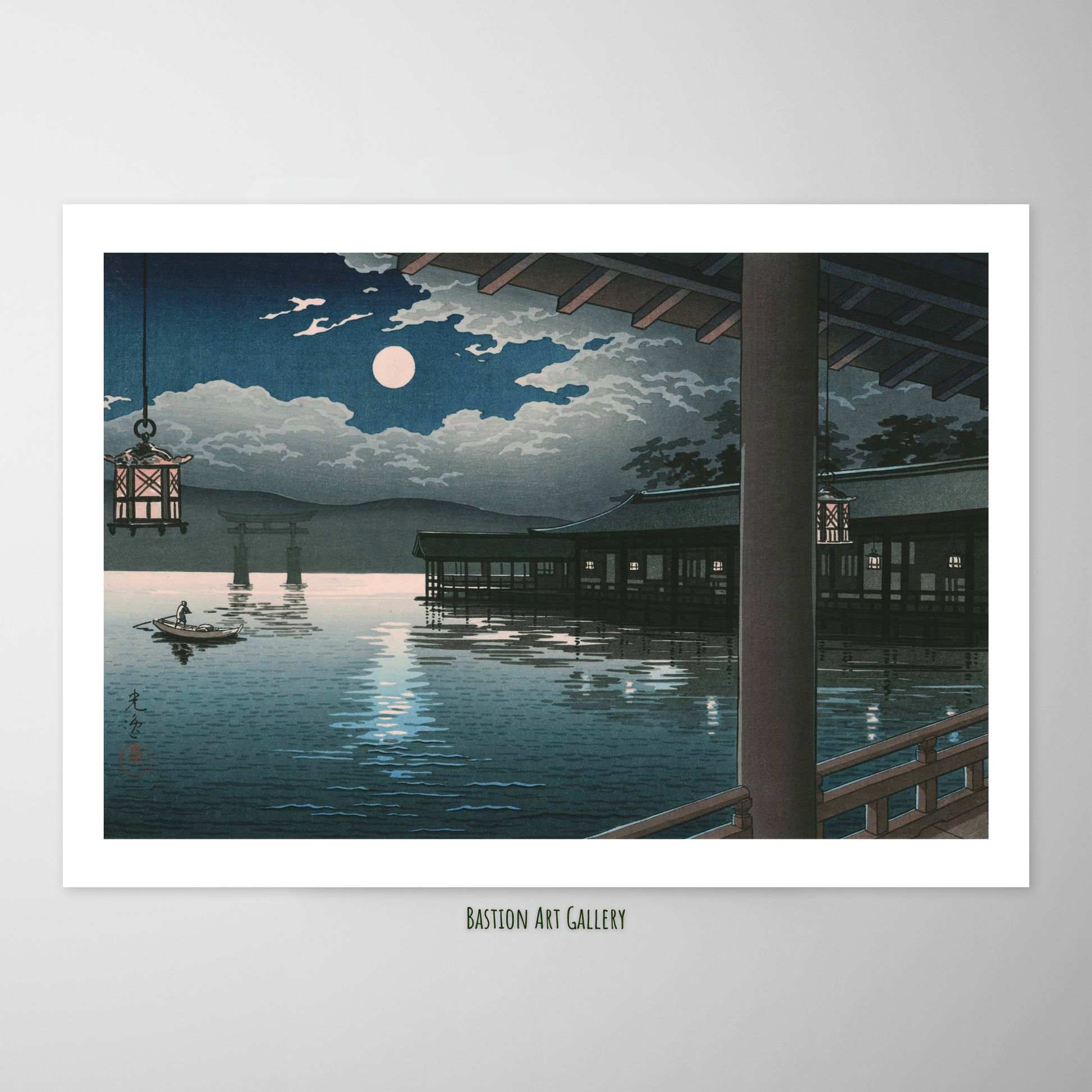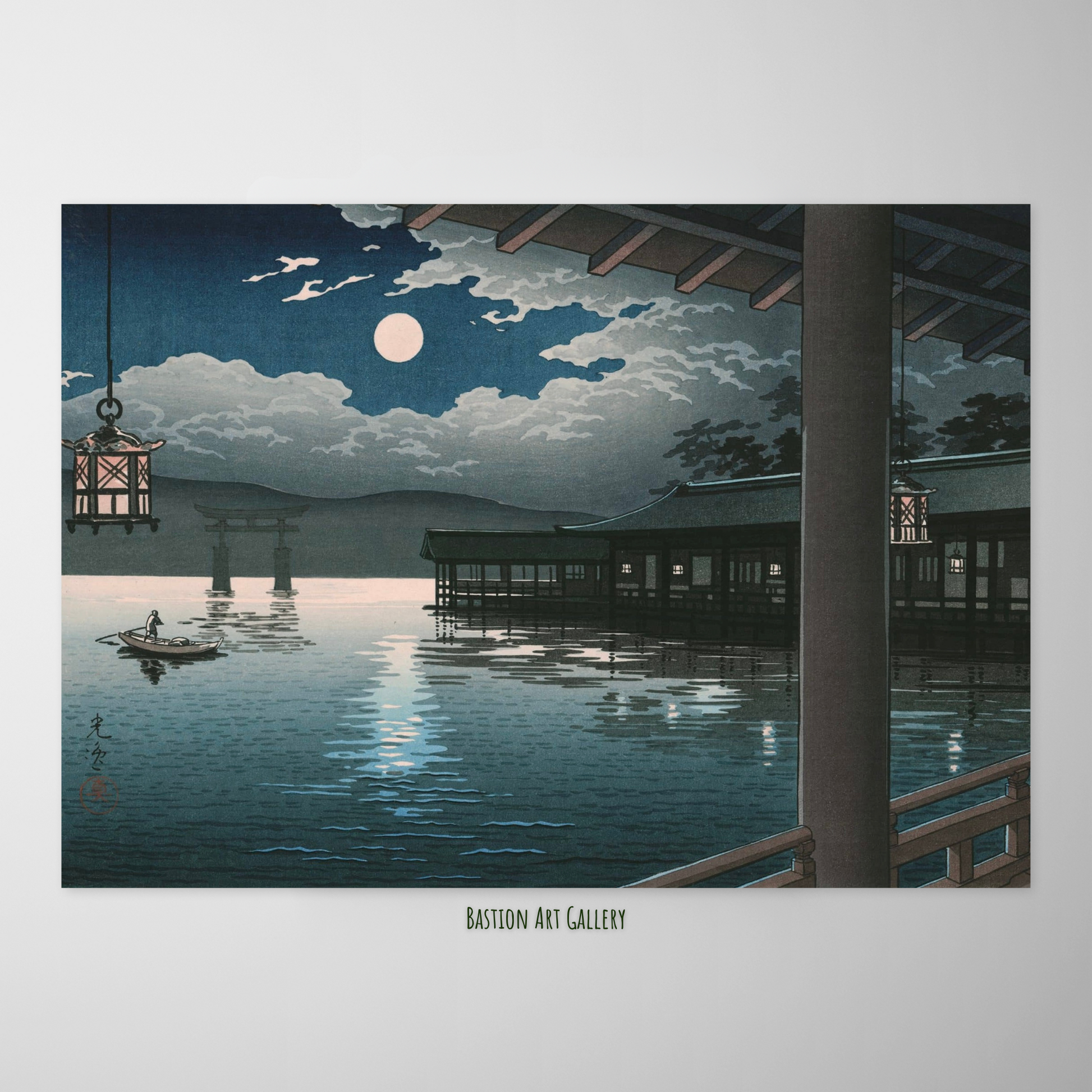 Nesta gravura, Tsuchiya Koitsu retrata a ilha sagrada de Miyajima, famosa pelo torii flutuante do santuário Itsukushima, sob o brilho sereno de uma lua de verão. A lua cheia domina o céu crepuscular, envolta por nuvens suaves, enquanto seus reflexos prateados iluminam delicadamente os pilares do torii e a superfície da água.