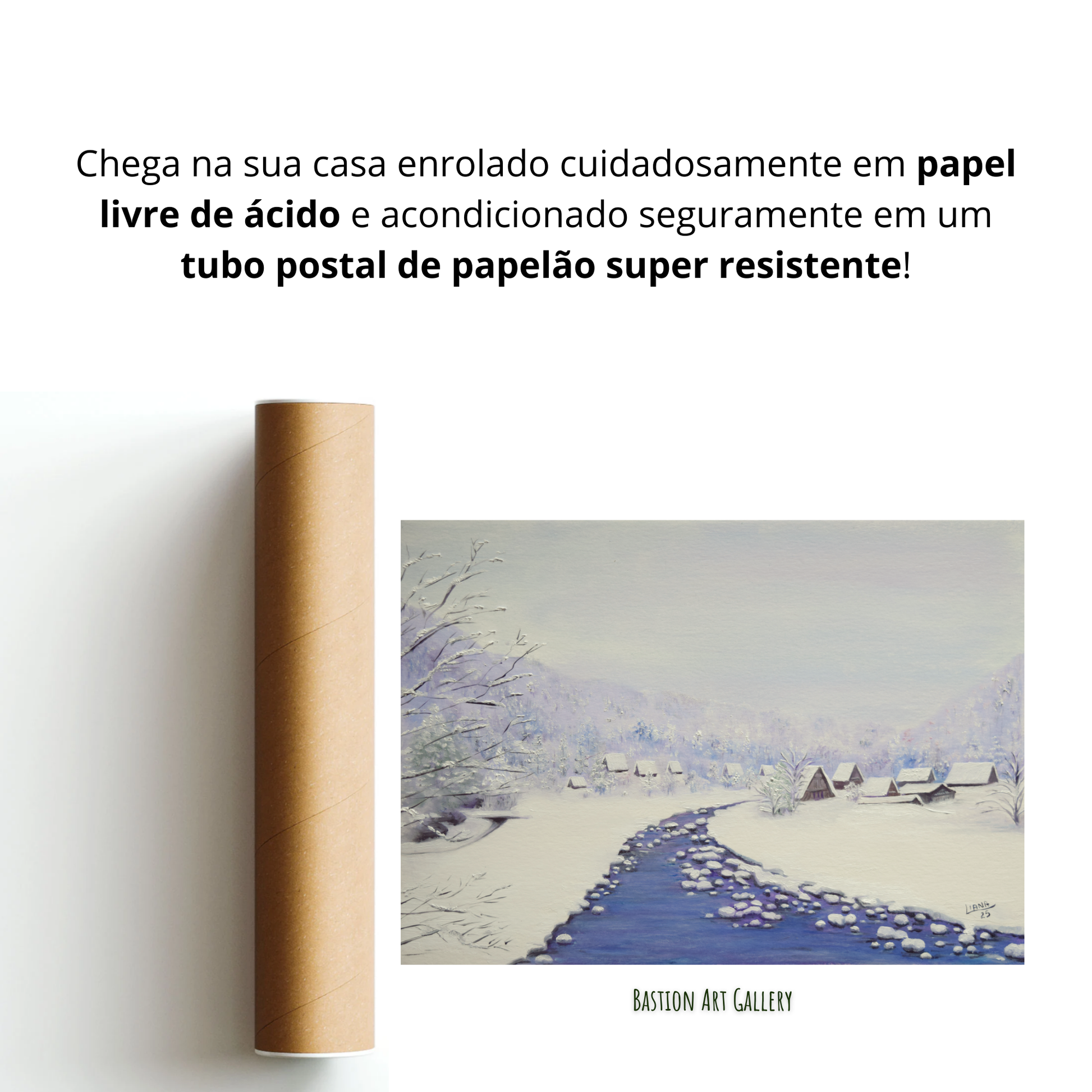 • A obra vai embalada de forma segura, protegida por papel livre de ácido e acondicionada em tubo postal resistente