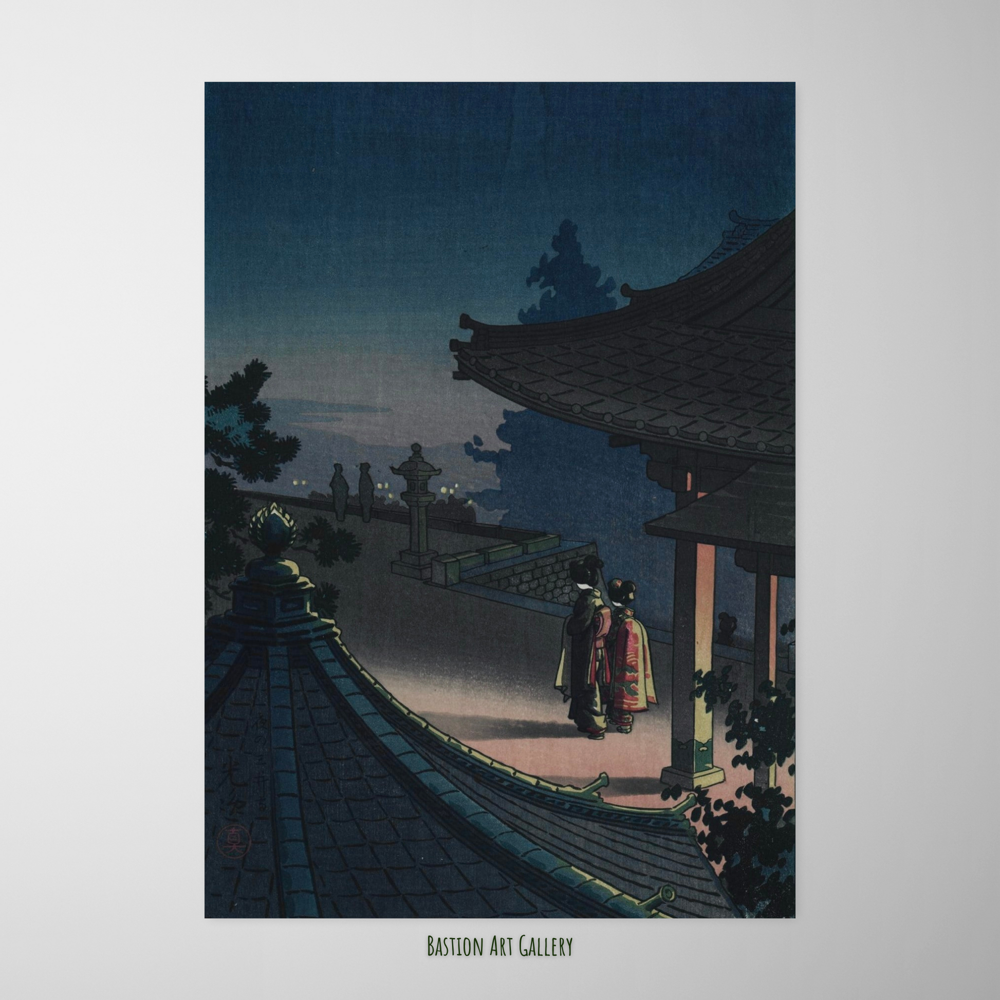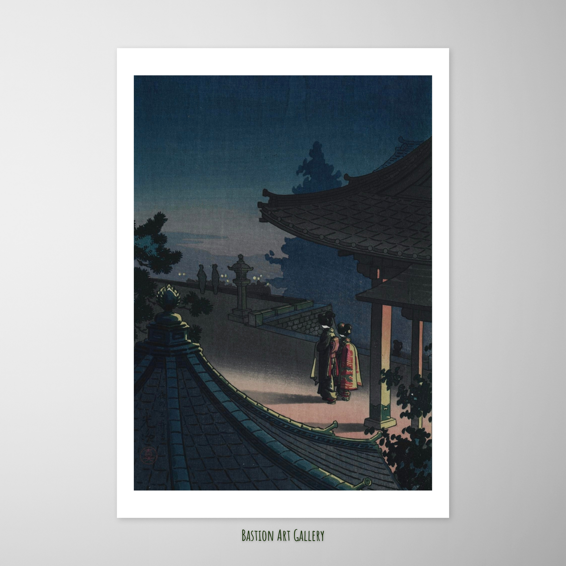 Koitsu utiliza o jogo de claras-escuras para realçar a estrutura arquitetônica do templo e a profundidade do terreno, sugerindo uma conexão íntima entre o humano e o sagrado. A cena parece celebrar a tradição e a paz interior, características centrais do shin-hanga.