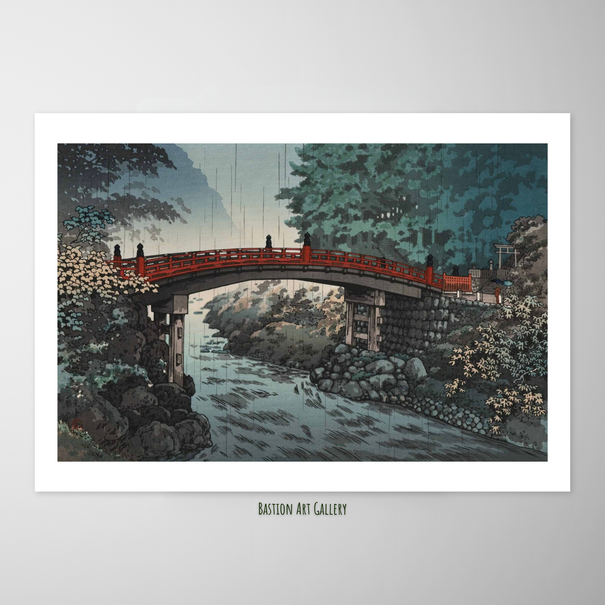 Nesta gravura, Tsuchiya Koitsu retrata a famosa Ponte Shinkyō (Shin-kyo) em Nikkō, que serve como portão para os santuários do complexo Futarasan. Durante um dia chuvoso de outono, a cena ganha uma atmosfera introspectiva e quase mística: o céu encoberto e a chuva delicada filtram a luz, criando reflexos úmidos na estrutura vermelha da ponte e sobre o riacho abaixo.