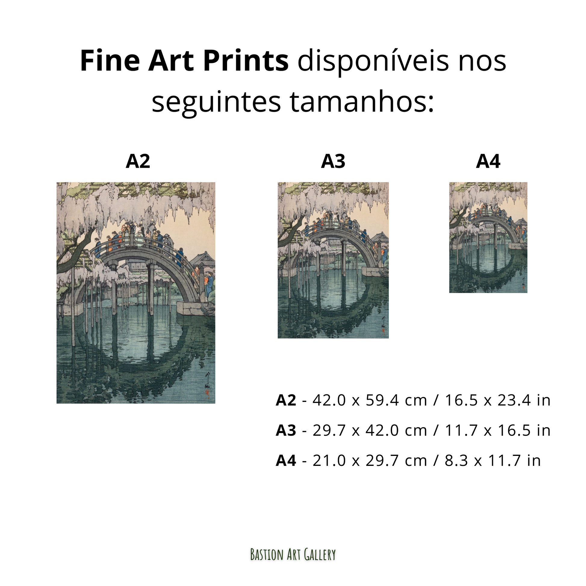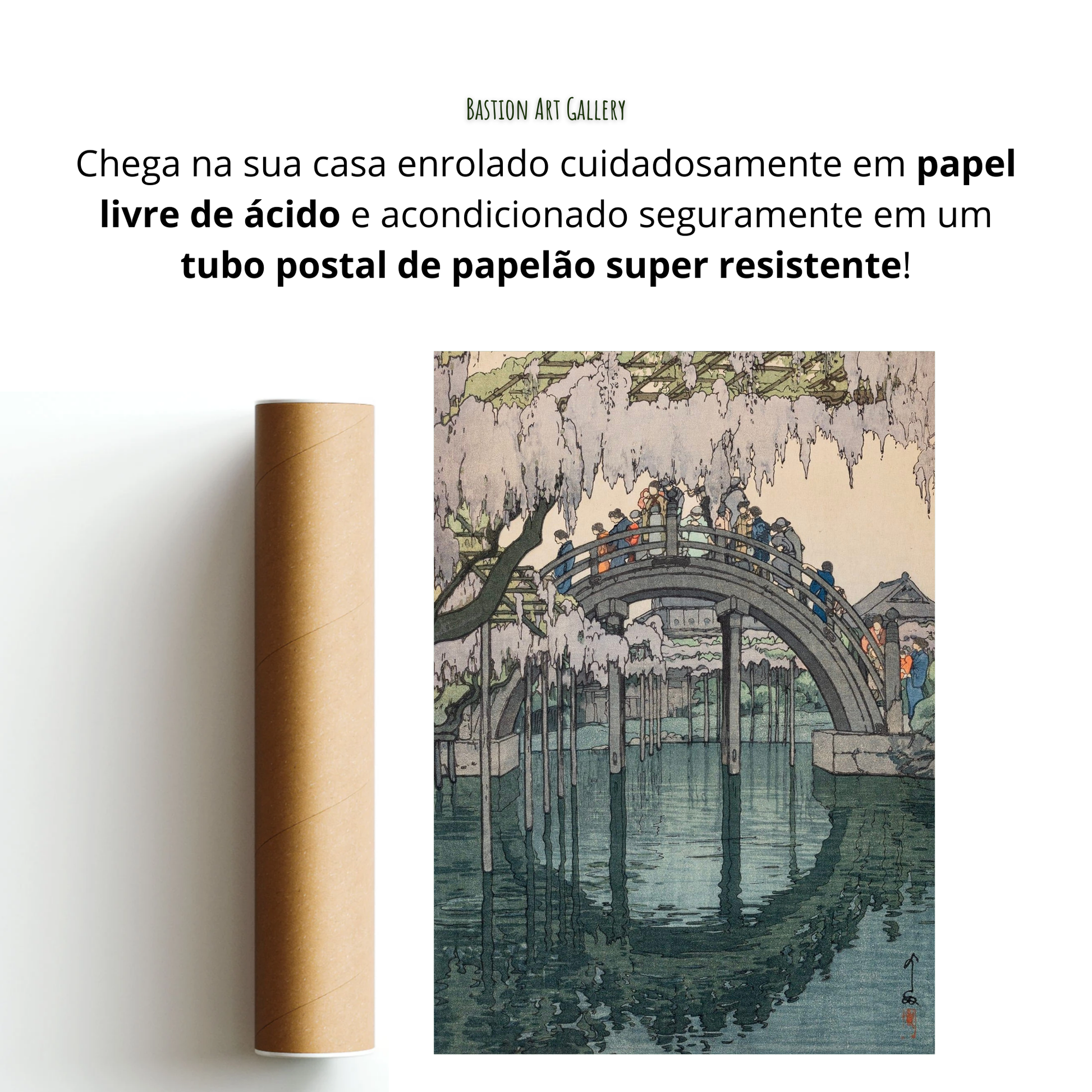 Nesta cena primaveril, Hiroshi Yoshida retrata a icônica ponte arqueada do santuário Tenjin em Kameido, envolta pelas delicadas cascatas de flores de glicínia que descem de suas pérgolas. A composição enfatiza a curvatura elegante da estrutura, cuja forma semicircular se reflete na superfície tranquila da água, criando um ritmo visual de equilíbrio e continuidade.