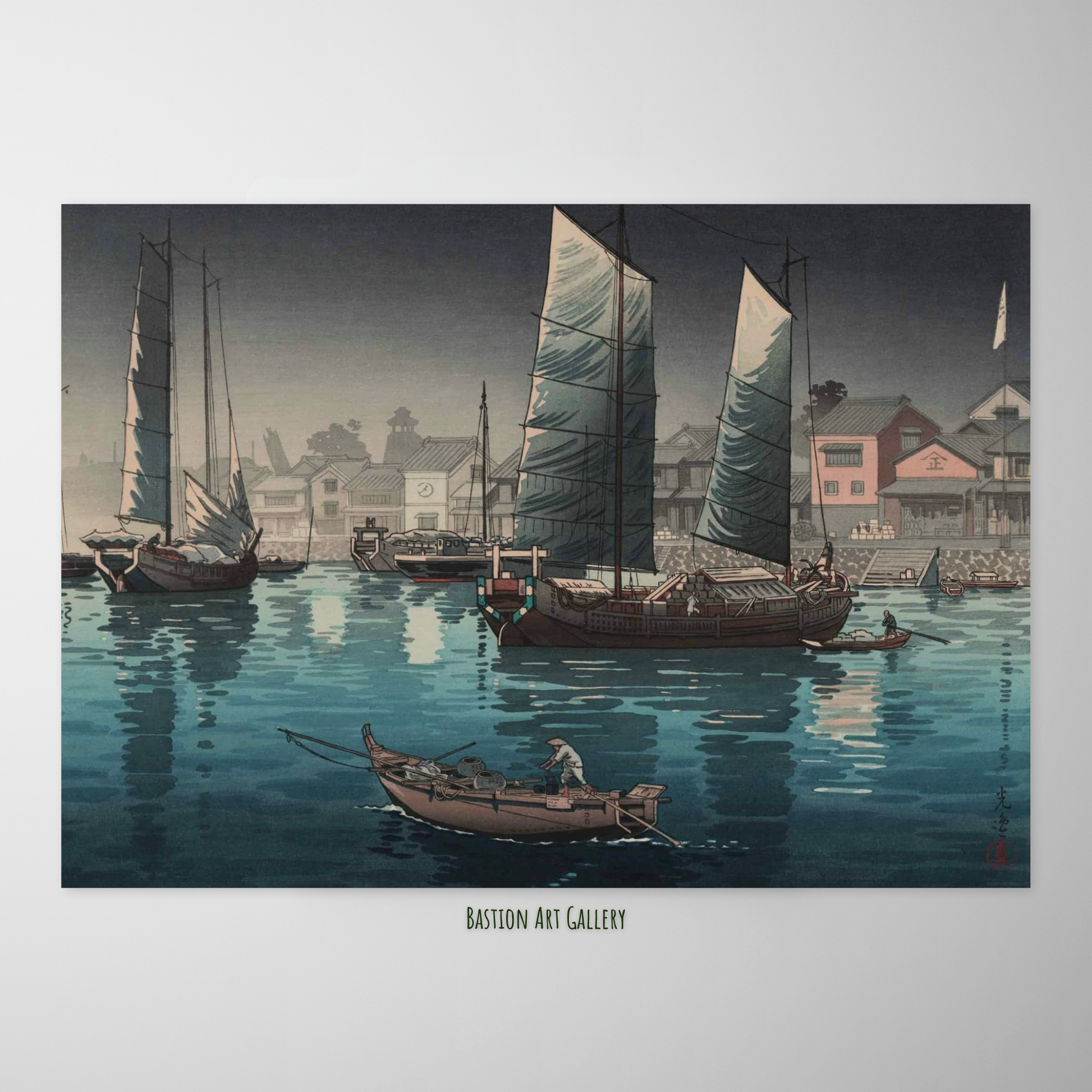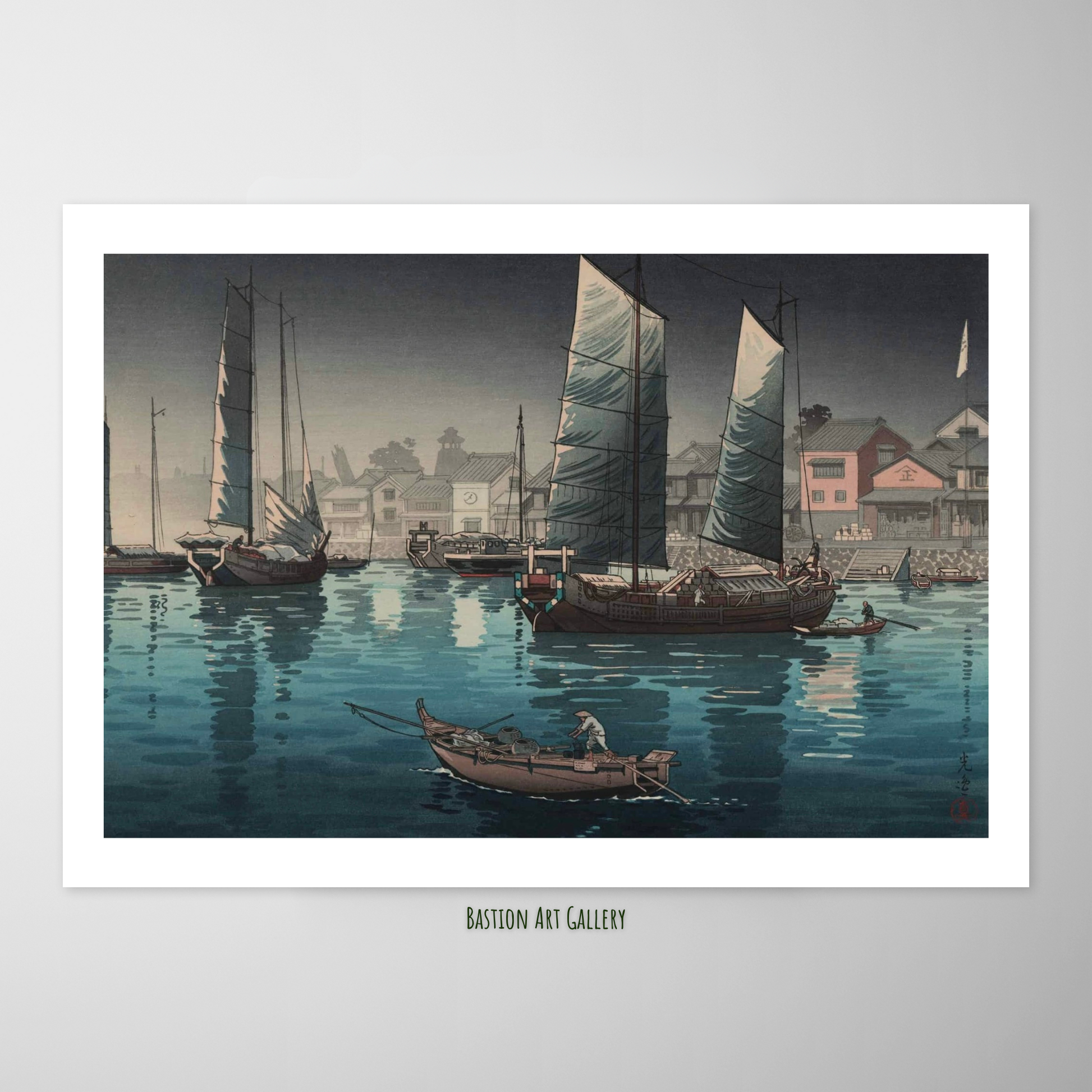 Nesta gravura shin-hanga, Koitsu retrata o porto de Akashi, às margens do Mar Interior de Seto, com uma atmosfera de serenidade noturna. A cena conjuga barcos tradicionais e construções portuárias sob uma luz suave, refletida na água calma. O estilo evidencia o domínio de Koitsu sobre efeitos de luz e sombra, criando um equilíbrio poético entre o movimento da água, o brilho das lanternas e o traço seco das embarcações. Essa obra, parte da série Sketches of Famous Places in Japan, revela a sensibilidade do artista para capturar a beleza sutil e melancólica do Japão entre tradição e modernidade.