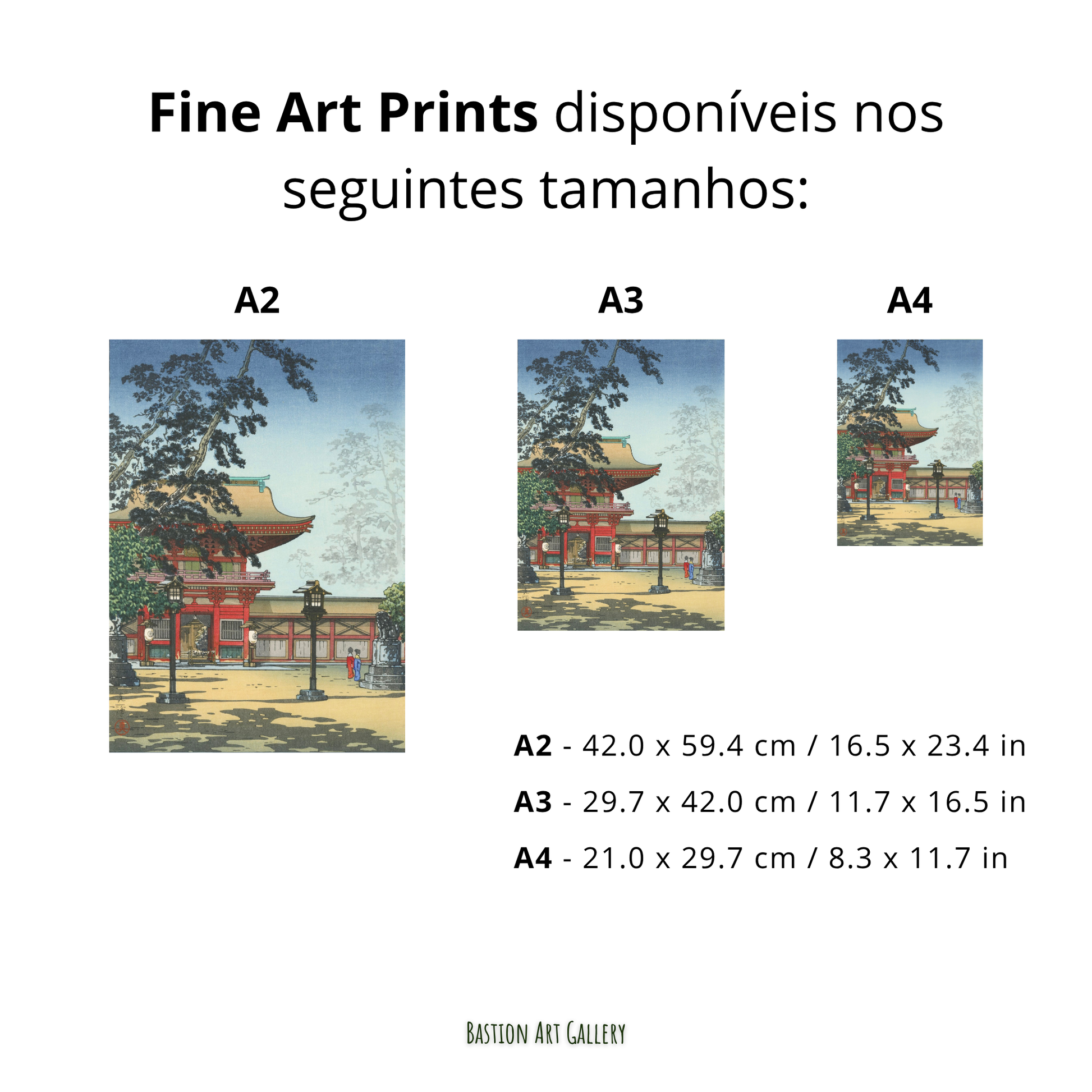 O santuário Hakozaki, representado de maneira contemplativa, torna-se não só um tema arquitetônico, mas também simbólico: a presença humana diante do sagrado sugere a relação entre tradição, fé e cotidiano, com a arte de Koitsu capturando esse equilíbrio de forma poética e introspectiva.
