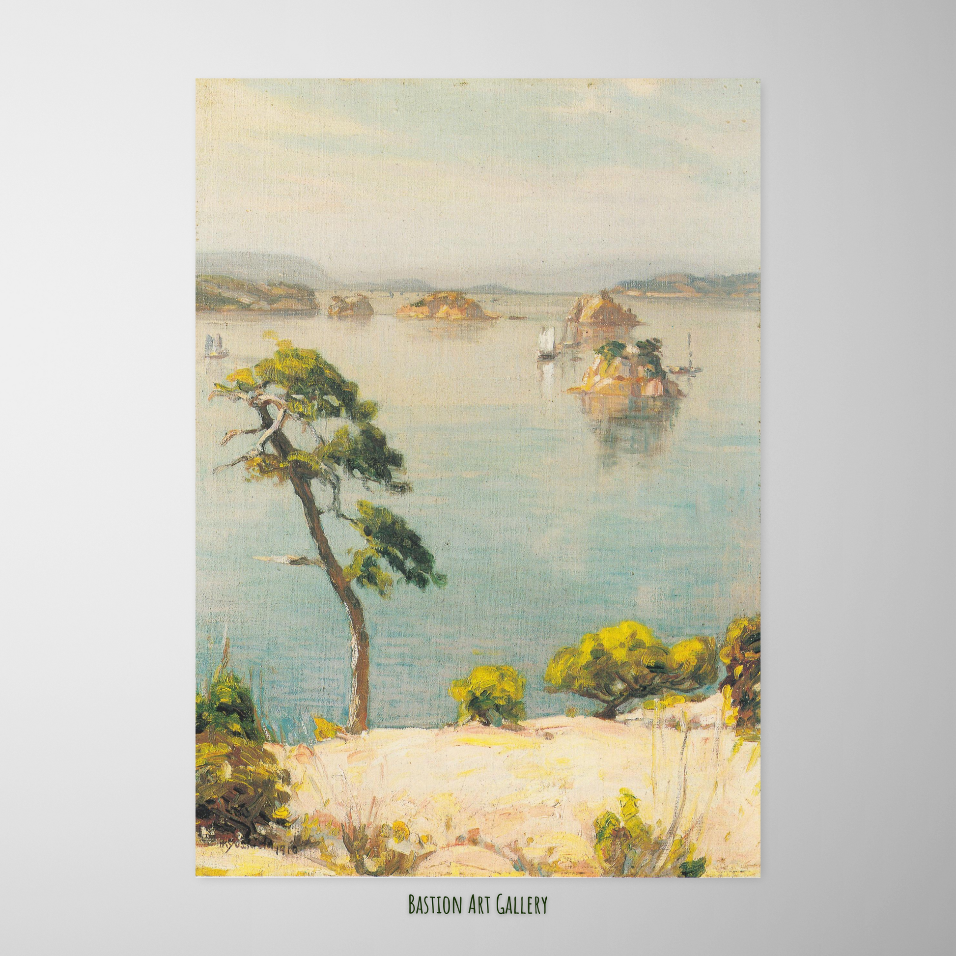 Nesta paisagem do Mar Interior de Seto, Hiroshi Yoshida apresenta uma cena serena marcada pela quietude das águas e pela presença dispersa de pequenas ilhas rochosas. No primeiro plano, um pinheiro inclinado rompe a horizontalidade da composição e conduz o olhar em direção às embarcações que deslizam suavemente ao fundo.