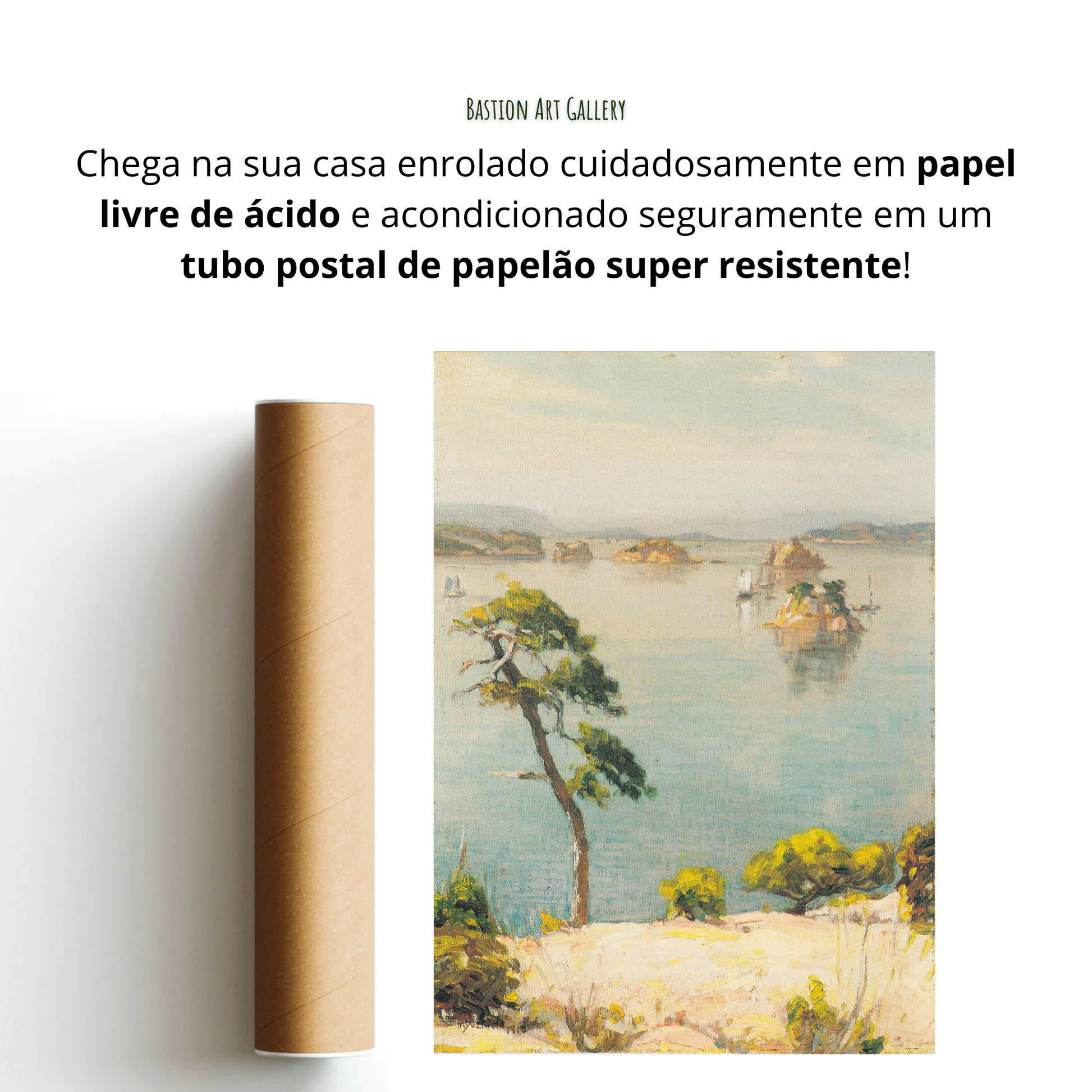 - A obra vai embalada de forma segura, protegida por papel livre de ácido e acondicionada em tubo postal resistente