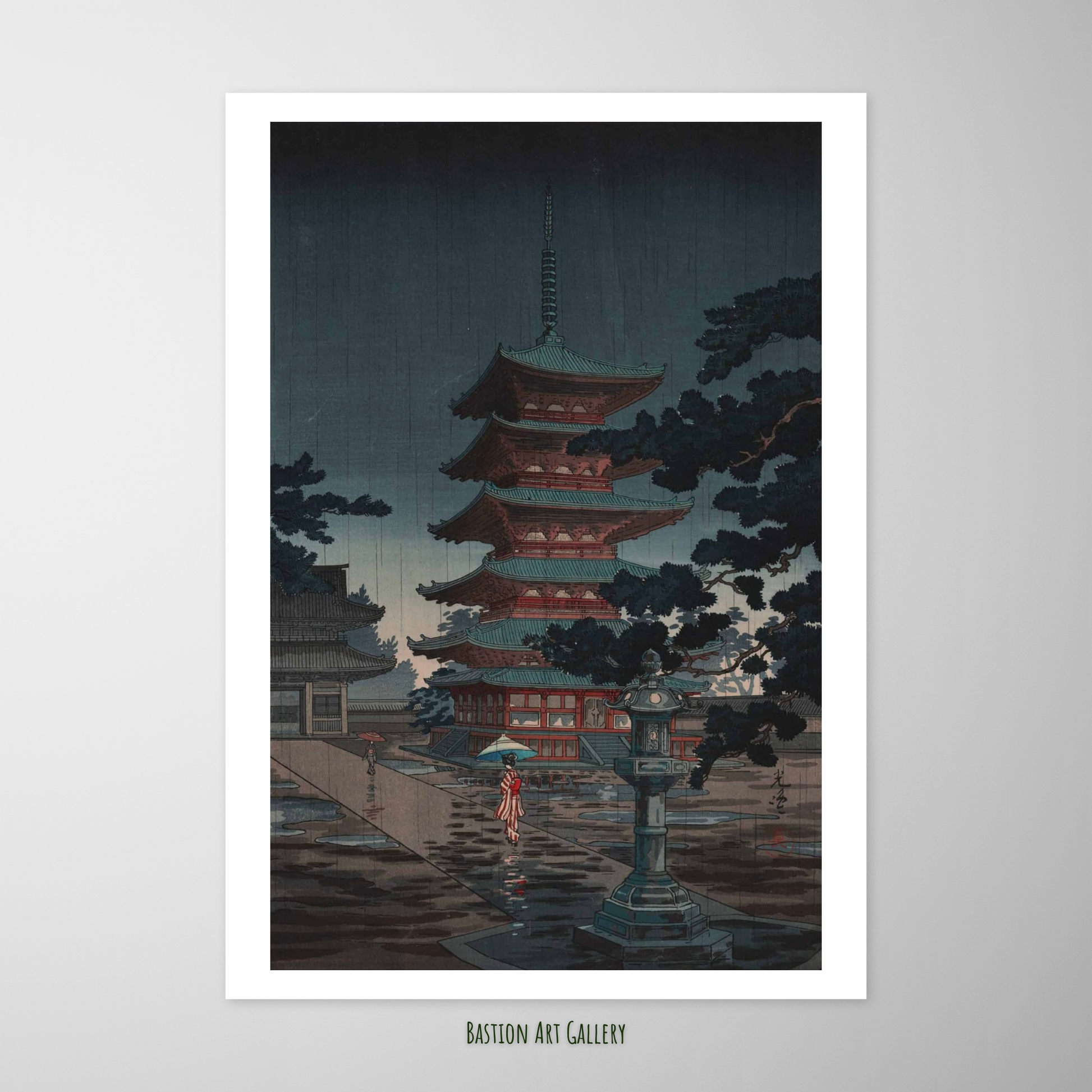A cena captura um momento chuvoso e melancólico, onde a pagoda se ergue com imponência, enquadrada por uma árvore de pinho à direita. Duas figuras femininas, com guarda-chuvas, caminham lentamente pelo caminho em direção ao portal do templo, o que adiciona dimensão humana e um senso de escala à composição.