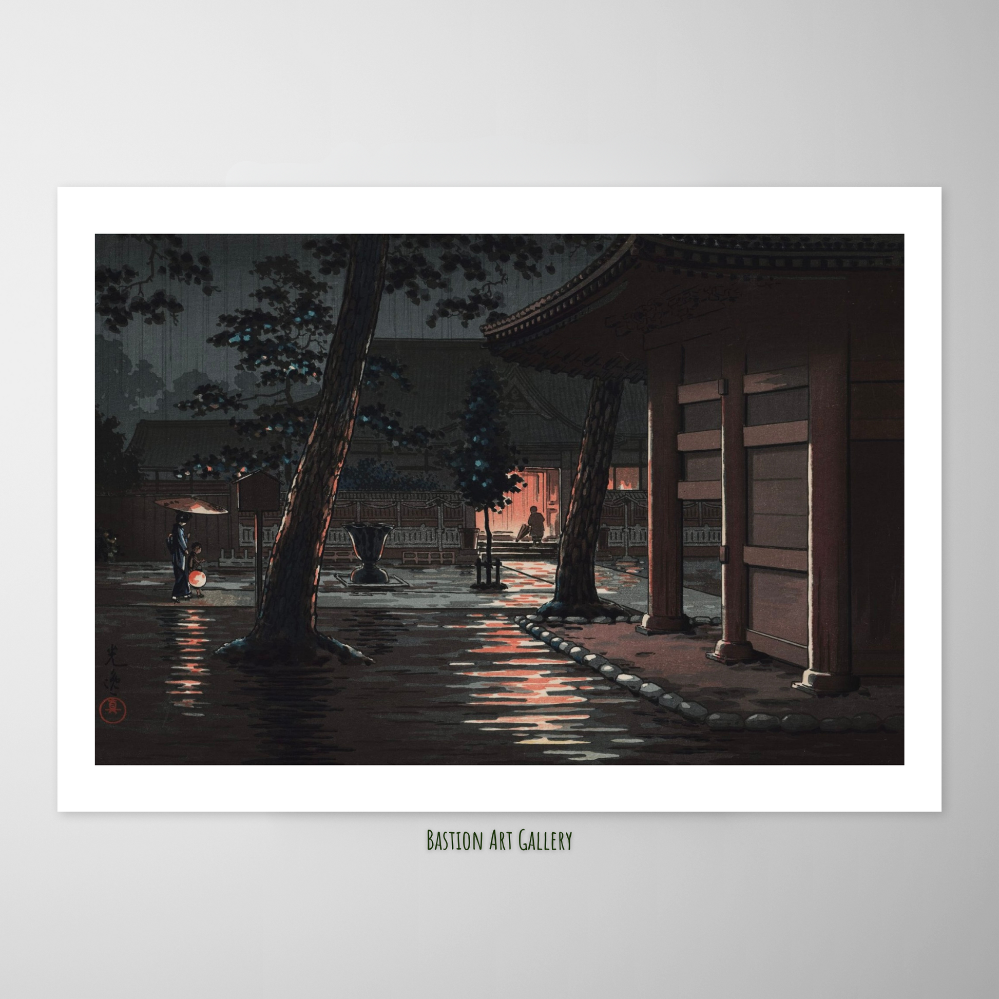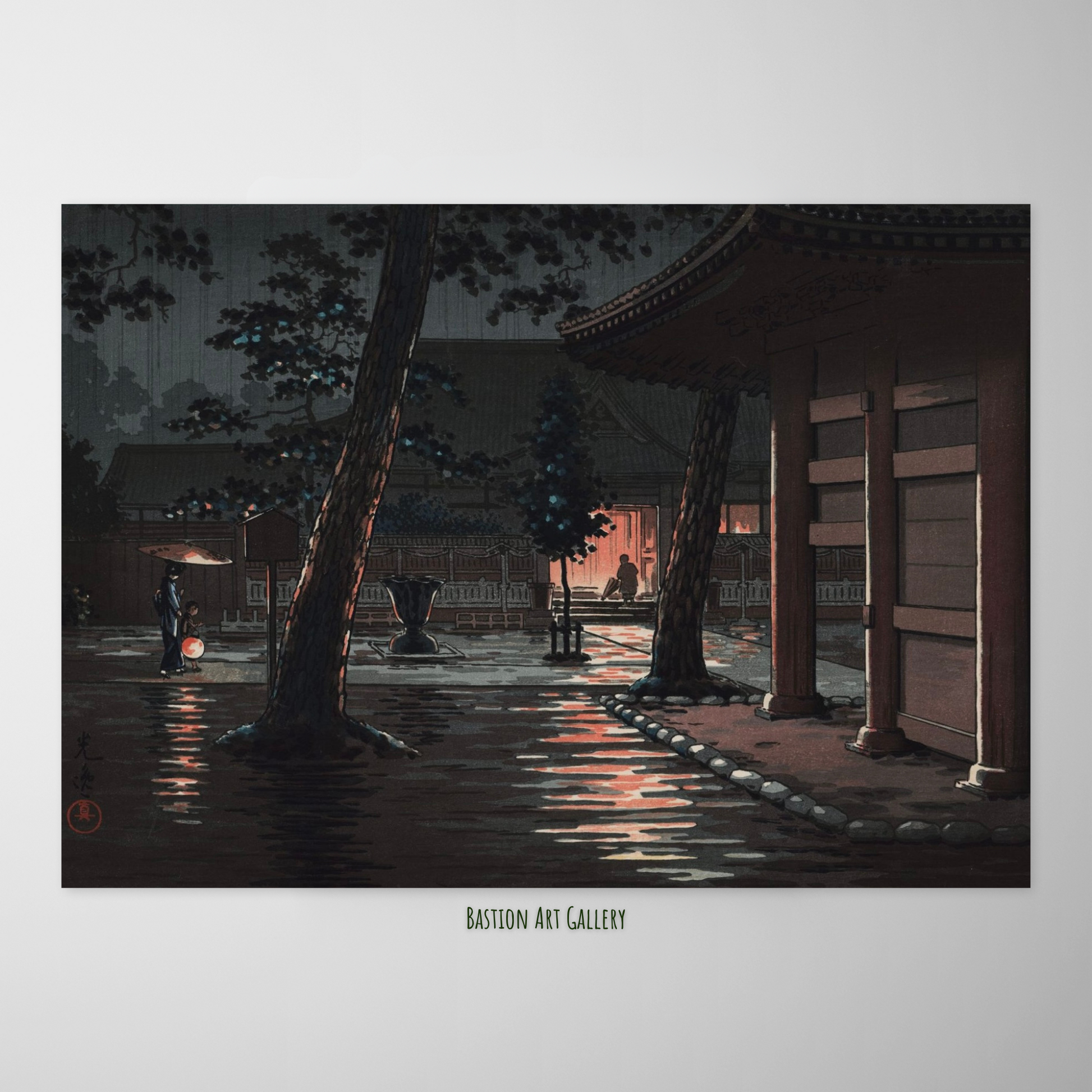 A composição é marcada pela sutileza da luz: lanternas e faróis iluminam figuras com guarda-chuvas, enquanto os reflexos da chuva se espalham sobre o chão de paralelepípedos e sobre a casca das árvores. Koitsu utiliza gradações tonais (bokashi) para capturar a textura da madeira do templo, a umidade das superfícies e a densidade atmosférica da noite chuvosa.
