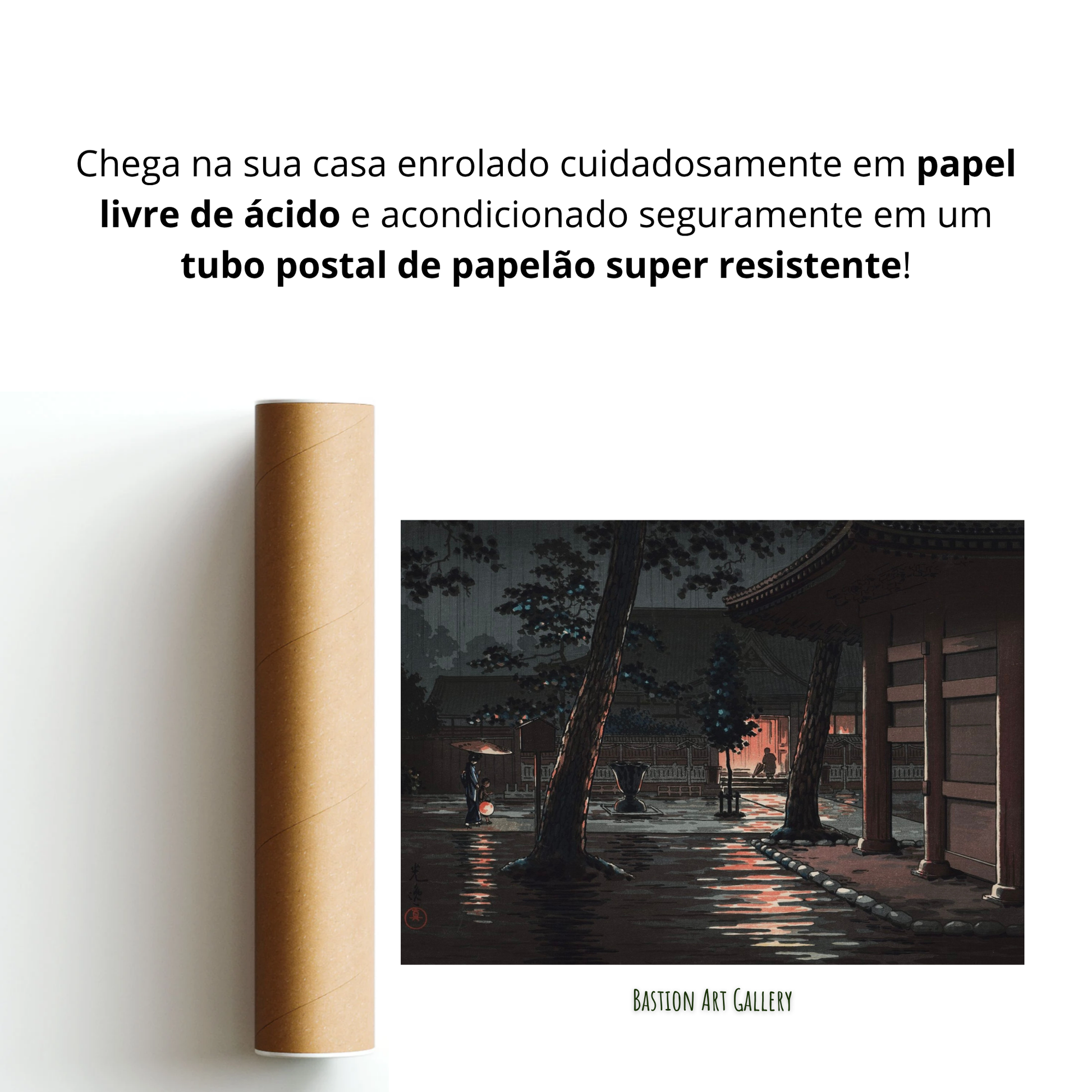 - A obra vai embalada de forma segura, protegida por papel livre de ácido e acondicionada em tubo postal resistente